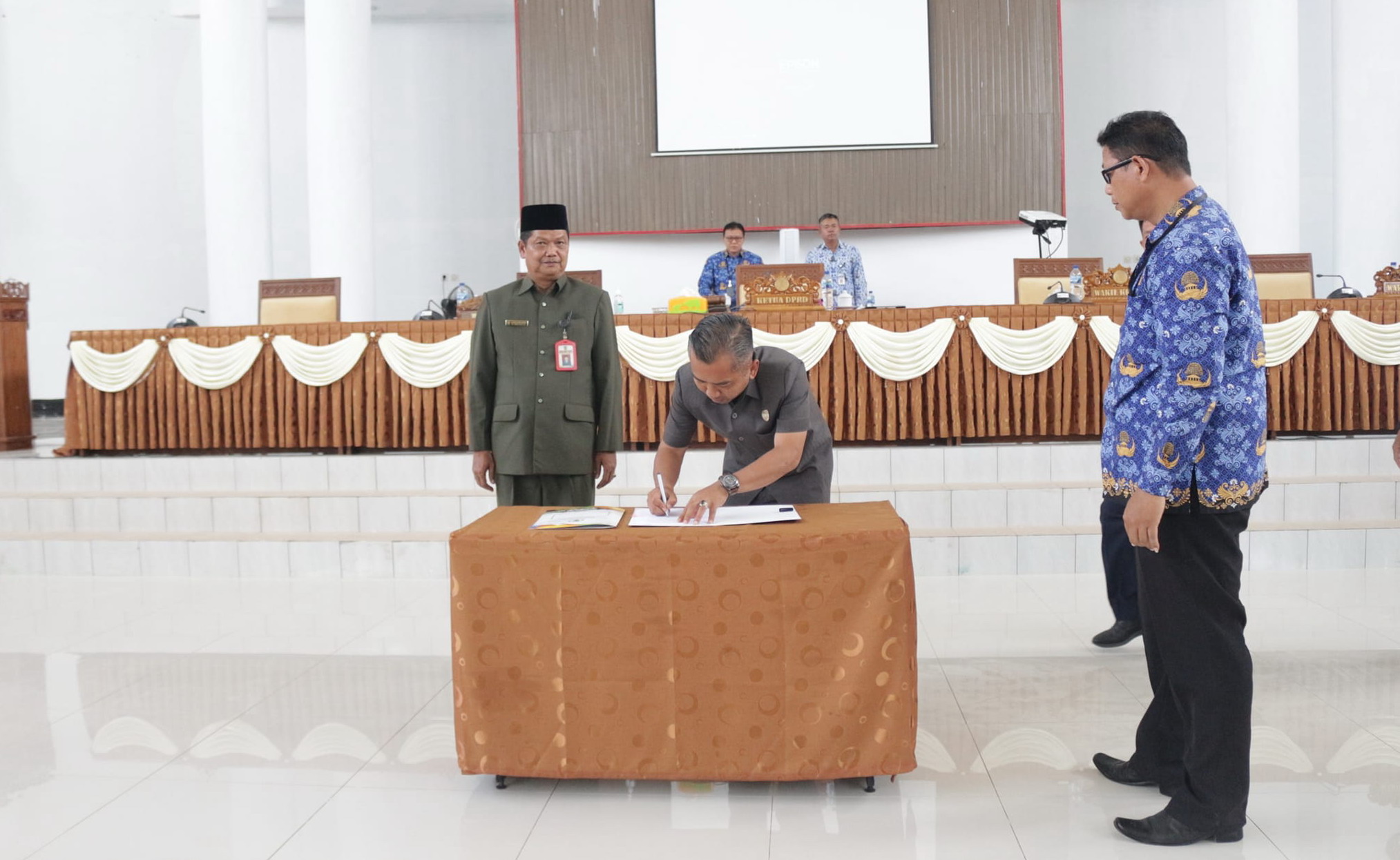 Rapat paripurna kemudian dilanjutkan dengan penandatanganan berita acara persetujuan bersama antara DPRD dengan Pemerintah Daerah Kabupaten Seruyan terkait Raperda APBD 2023.