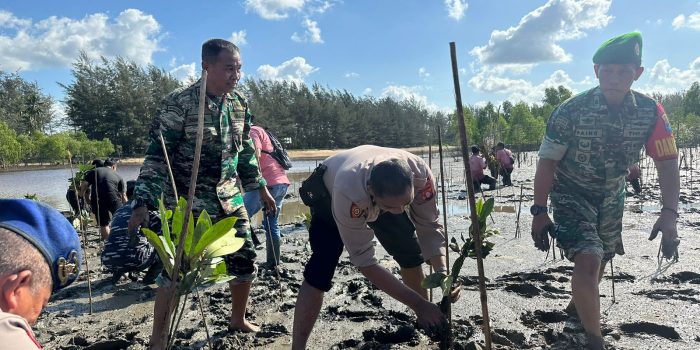 Personil Sat Samapta laksanakan giat penanaman pohon mangrove di Sungai Bakau Kuala Pembuang bersama TNI bertujuan untuk timbulnya selalu tali persaudraan dan juga menjaga alam kita di wilayah Kabupaten Seruyan.