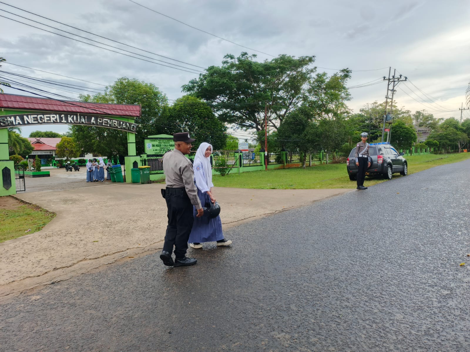 Selain mengatur lalu lintas, personel juga aktif membantu menyeberangkan siswa-siswi SMAN 1 Kuala Pembuang. Dengan sigap, mereka menghentikan arus kendaraan sementara waktu hingga seluruh siswa dapat menyeberang dengan aman.