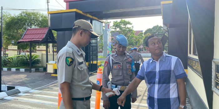 Mengingat selain anggota Polres, setiap harinya tidak sedikit masyarakat yang datang untuk keperluan pelayanan sehingga tidak menutup kemungkinan adanya penyebaran covid-19 yang terbawa masuk sehingga kita wajib dilaksanakan pengecekan suhu badan.