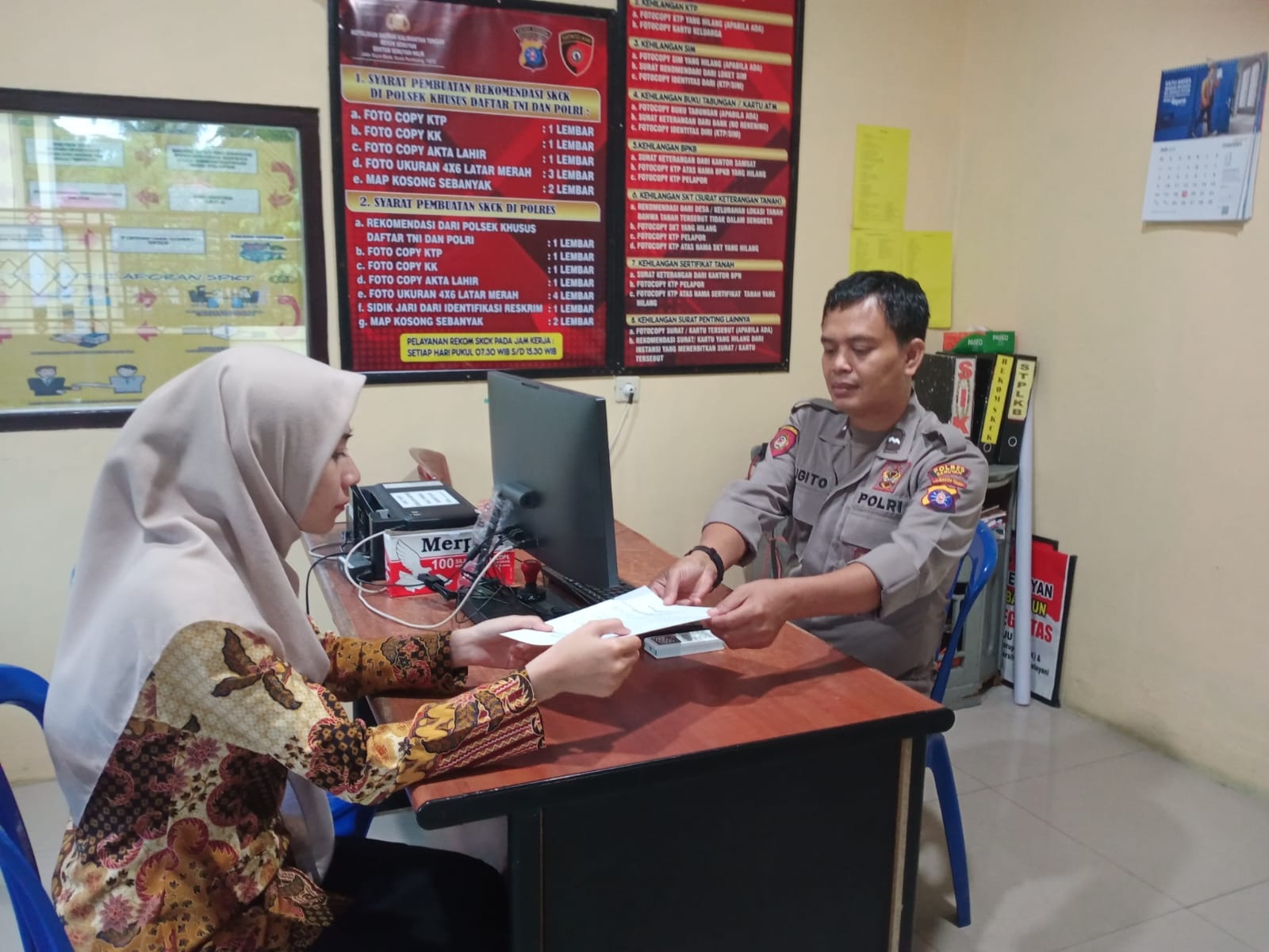 Personel Piket SPKT Polsek Seruyan Hilir memberikan pelayan prima kepada masyarakat, salah satunya berupa pembuatan Surat Tanda Penerimaan Laporan Kehilangan Barang.