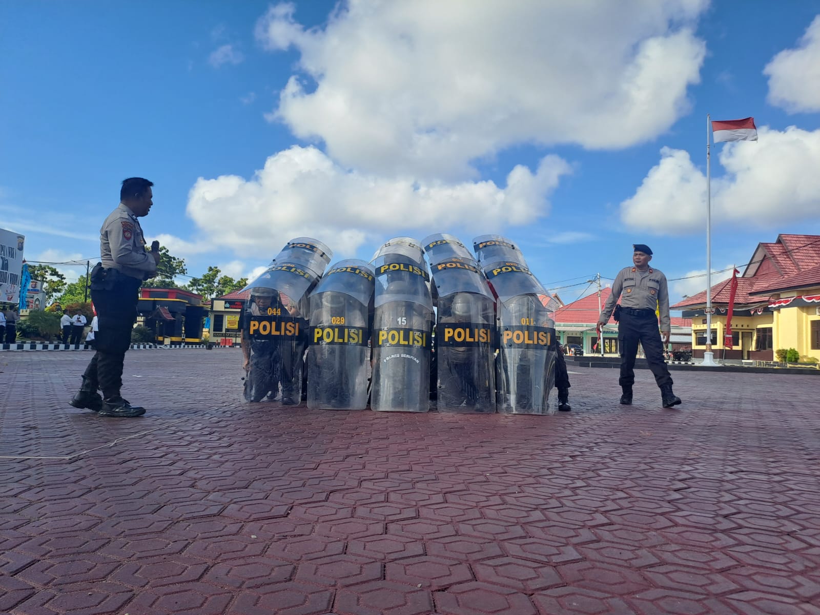 Tampak puluhan personel dalam melaksanakan gerakan dalmas dengan tameng serta tanpa tameng.